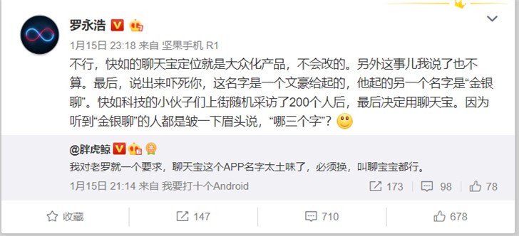 昨日晚间,罗永浩回复网友“聊天宝”能否改名一事时表示: