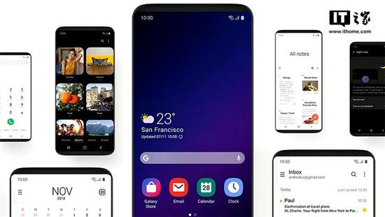 在今年SDC 2018开发者大会上三星推出了全新的One UI。主要在视觉上进行优化,风格更为简洁。界面中使用了大量圆角设计,且在操作点击的位置更偏向画面下方,更适合屏幕比例较长的手机,使用者在单手操作下更为方便。One UI将在2019年率先在Galaxy S9系列、Galaxy Note 9上更新。