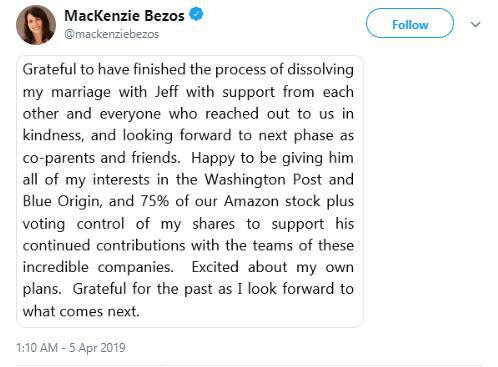 美东时间4日周四,亚马逊CEO贝索斯的前妻MacKenzie Bezos公布,完成了离婚流程,将共同持有的多数亚马逊股票和所有华盛顿邮报和Blue Origin的持股统统留给了贝索斯,这些股票的控制权也交给贝索斯。