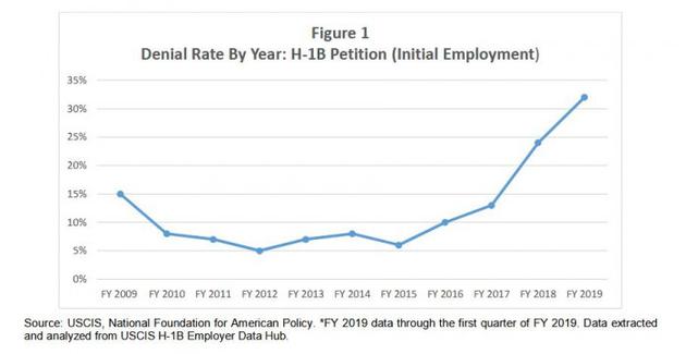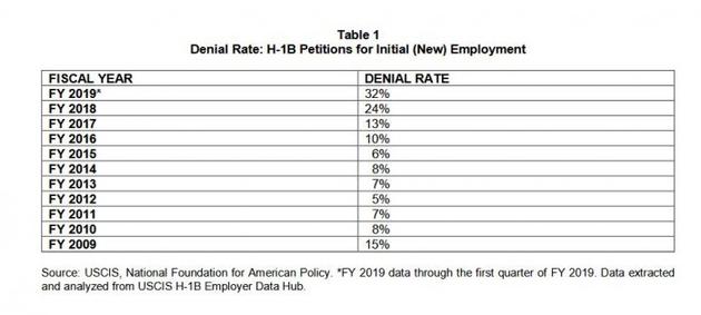 在新签证方面,美国公民及移民服务局的被拒概率从2016年的10%增加到2018年的24%,增加了一倍以上。而在2019年第1季度被拒率达到了32%。虽然特朗普政府承诺会签署更多H-1B签证,但是这种情况在短期内不会发生改变。