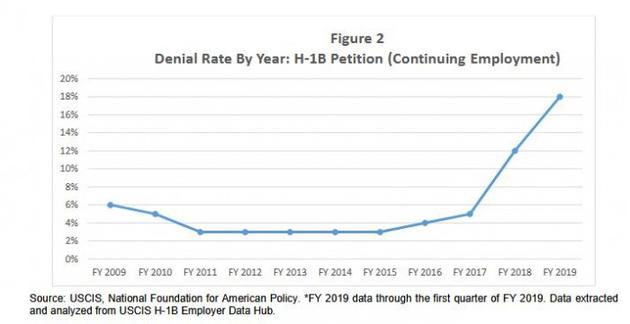 根据美国国家政策基金会(一个专门研究移民的非盈利组织)发布的最新分析报告称,像Usha这样试图延长签证的申请人被拒的概率从2016年的4%增加到2018年的12%。而在2019年第1季度被拒概率甚至更高,达到了18%。