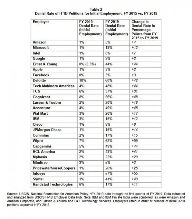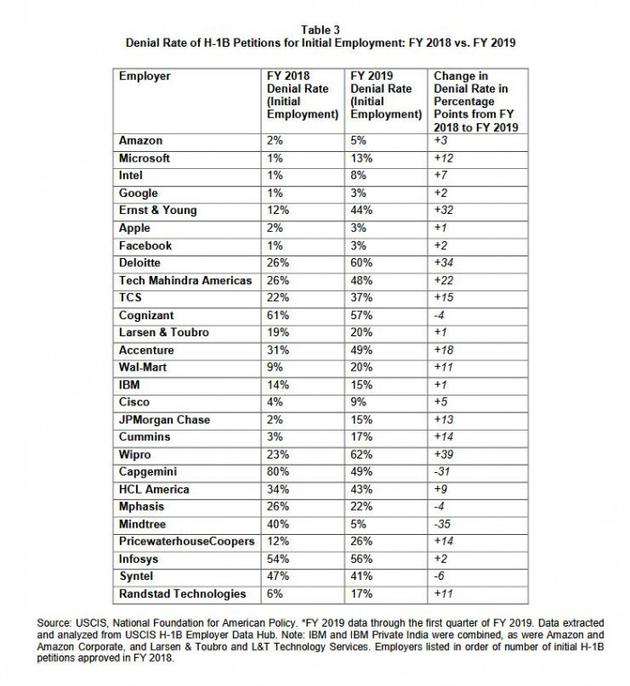 不过特朗普政府的政策调整完全打破了那些依靠H-1B签证雇佣外国员工的外包公司的平衡。2018年,亚马逊成为了获得新签证最多的公司。与此同时,那些曾经获得新签证最多且被拒率低至个位数的外包公司,在2019年第1季度飙升至50%以上。