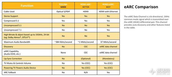 HDMI 2.1的TMDS频率翻倍,达到了1200Hz,数据通道从3个增加4个,使用了新的16b/18b编码,因而带宽提升到48Gbps、最大传输速率提高42.6Gbps,最高可传速8K/60P 10bit 4:2:0或10K30P 12bit 4:2:0视频,假若传输VESA DSC 1.2a标准压缩视频,最高可传输10K/120P 12bit 4:2:0,速度有了质的提升。同时将ARC(音频回传)升级到eARC,eARC使用的是双向1MHz共模信号,通过双差分线传输,带宽提高到37Mbit/s,可传输未压缩的5.1和7.1声道音频,高品质的Dolby Atmos、DTX:X音频,音效提升极为明显。