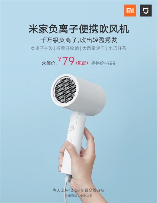 9月4日消息,今天上午10点,米家负离子便携吹风机在小米商城正式开启众筹,零售价99元,众筹价仅需79元(包邮)。